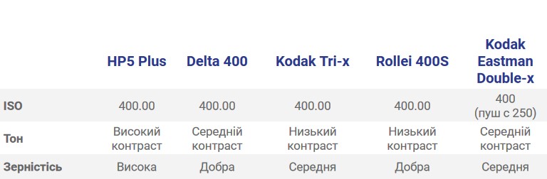 Особливості: дрібне зерно, висока різкість із середнім контрастом