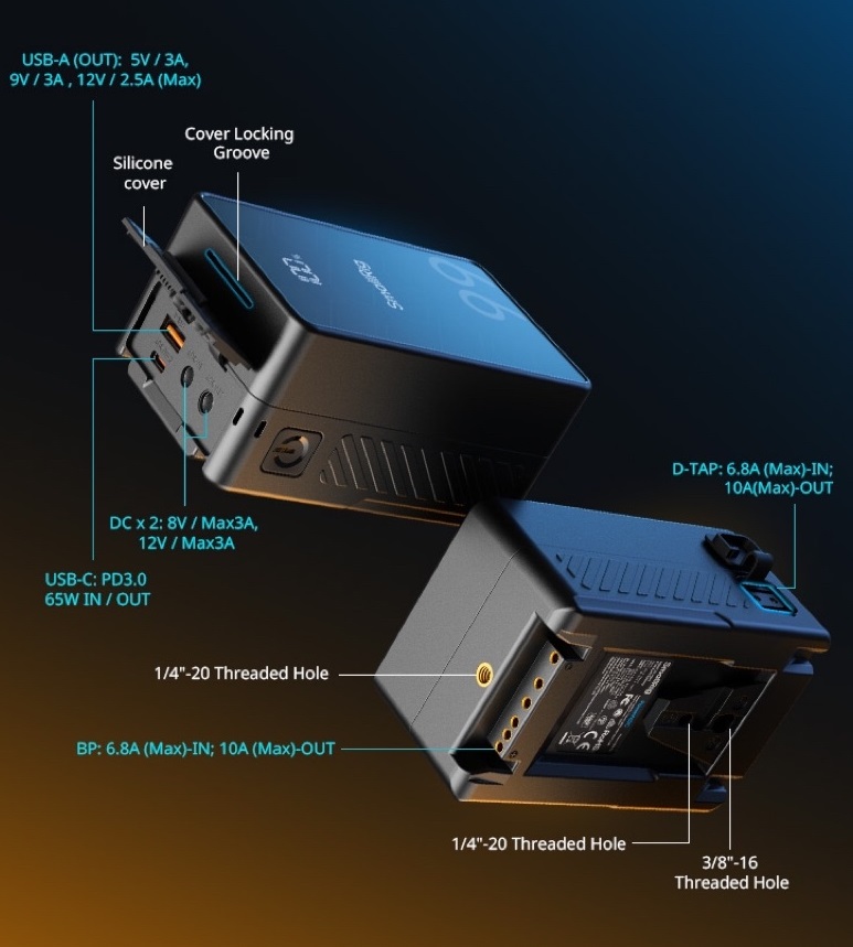 Цей акумулятор V-Mount обладнаний портами USB-C, USB-A, DC 5.5 x 2.1 мм (8V), DC 5.5 x 2.5 мм (12V), BP та D-TAP, що робить його універсальним для одночасного живлення кількох пристроїв: камери DSLR, відеокамери, монітора, смартфона, передавача, планшета, ноутбука, відеосвітла тощо. На задній панелі V-mount є отвори 6.35 мм-20 та 9.53 мм-16, а на нижній частині – отвір 6.35 мм-20, що дозволяє закріпити його за допомогою кульової головки або іншого затискача.