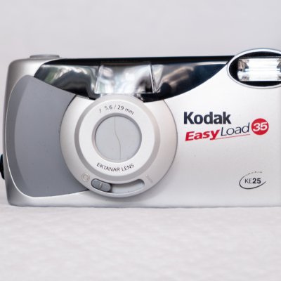 Kodak EasyLoad 35 KE25 - это камера эпохи 2000-х годов для 35-мм пленки.Она имеет 29 мм объектив с фиксированным фокусом, встроенную вспышку, которая срабатывает каждый раз, и встроенную сдвижную крышку объектива. Фокусное расстояние составляет 1,2 м до бесконечности.Рекомендуется пленка 400 ISO. Объектив: 29 мм, гибридный объективЗатвор: на 1/200 секундыДиафрагма: F / 5,6Скорость пленки: DX (ISO) 100, 200 или 400 Диапазон фокусировки: дневной свет: (1,2 м) до бесконечностиВидоискатель: обратный галилеевскийВспышка: встроенная, вспышка каждый разВремя перезарядки вспышки: 6...