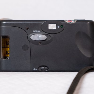 Недорогая камера с фиксированным объективом. Фотоаппарат имеет несколько очень интересных функций. Во-первых, объектив представляет собой 29-миллиметровый «цельностеклянный эктанар», и имеет диафрагму f5,6. В этой камере есть проецируемые линии видоискателя и метка автофокуса, что не является дешевой спецификацией. Есть мягкие резиновые вставки, что позволяет хорошо удерживать камеру, а не холодный пластик. Сзади есть ЖК-дисплей с обычными режимами вспышки, фокусировки на бесконечность и даже подсветка синего нажатием кнопки, приятно. Самое интересное - это система Kodak easy load...